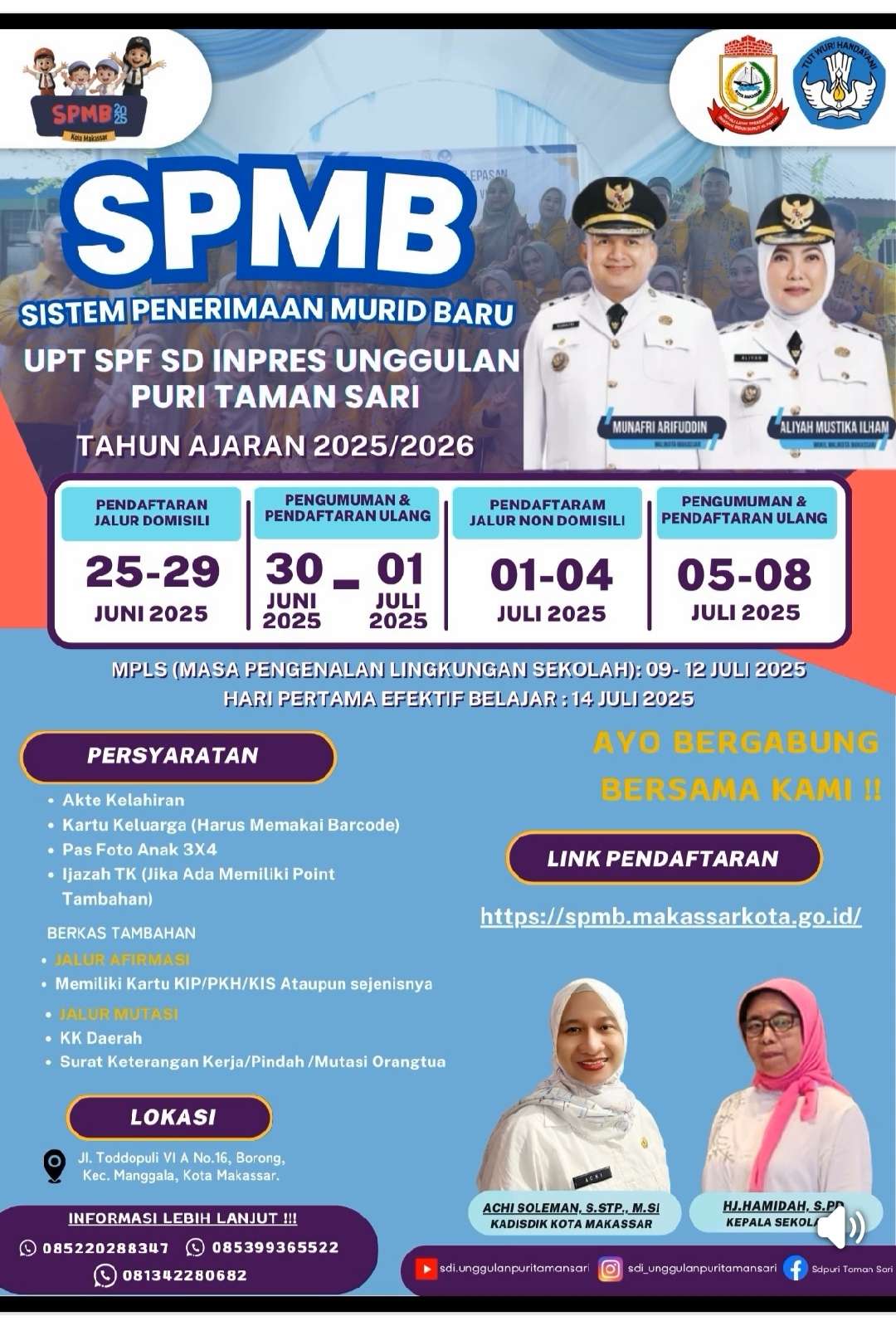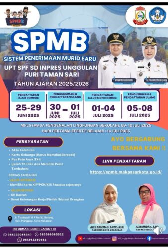TARGETNASIONAL, ONLINE, MAKASSAR— Pelaksanaan Sistem Penerimaan Murid Baru ( SPM ) 2025./ 2026. Di UPT SPF SD Inpres Unggulan Puri Taman Sari Makassar, sementara ini masih belangsung. SPMB tingkat dasar ini dilaksanakan sejak hari pertama jalur domisili,Senin, 25 Juni 2025. Kemaren. Hingga memasuki hari ke 4 jalur non domisili ini 4 Juli 2025 berjalan dengan baik dan lancar.